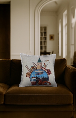 Dünya Şehirleri Goblen, renkli çözgü ve atkı ipliklerinin yüzyıllardır kullanılan geleneksel dokuma teknikleriyle modern makinelerde işlenmesiyle üretilen özel bir kumaş türüdür. Bu ürün, goblen dokuma ile üretilmiş dekoratif bir yastıktır. Bu koleksiyonda, dünyanın dört bir yanındaki ikonik şehir manzaraları işlenmiştir.