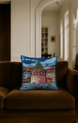 Dünya Şehirleri Goblen, renkli çözgü ve atkı ipliklerinin yüzyıllardır kullanılan geleneksel dokuma teknikleriyle modern makinelerde işlenmesiyle üretilen özel bir kumaş türüdür. Bu ürün, goblen dokuma ile üretilmiş dekoratif bir yastıktır. Bu koleksiyonda, dünyanın dört bir yanındaki ikonik şehir manzaraları işlenmiştir.