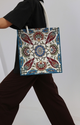 Etnik Eserler Goblen, renkli çözgü ve atkı ipliklerinin yüzyıllardır kullanılan geleneksel dokuma teknikleriyle modern makinelerde işlenmesiyle üretilen özel bir kumaş türüdür. Bu ürün, goblen dokuma ile üretilmiş şık bir heybedir. Bu koleksiyonda, farklı kültürlerden ve etnik motiflerden ilham alan tasarımlar yer almaktadır.