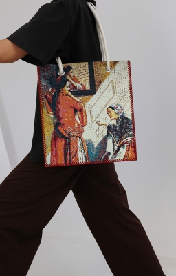 Portre Goblen, renkli çözgü ve atkı ipliklerinin yüzyıllardır kullanılan geleneksel dokuma teknikleriyle modern makinelerde işlenmesiyle üretilen özel bir kumaş türüdür. Bu ürün, goblen dokuma ile üretilmiş zarif bir heybe çantadır. Bu koleksiyonda, farklı kültürlerden insan portrelerinden ilham alan tasarımlar yer almaktadır.