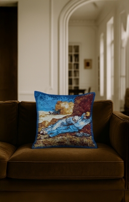 Ünlü Sanatçıların Eserleri Goblen, renkli çözgü ve atkı ipliklerinin yüzyıllardır kullanılan geleneksel dokuma teknikleriyle modern makinelerde işlenmesiyle üretilen özel bir kumaş türüdür. Bu ürün, goblen dokuma ile üretilmiş dekoratif bir yastıktır. Bu koleksiyonda, ünlü sanatçıların ölümsüz eserleri kumaş üzerinde yeniden hayat bulmuştur.
