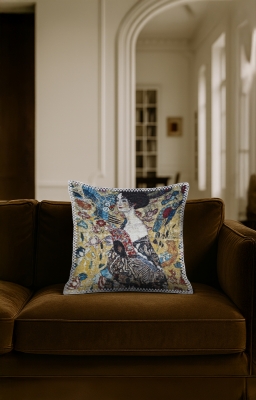 Ünlü Sanatçıların Eserleri Goblen, renkli çözgü ve atkı ipliklerinin yüzyıllardır kullanılan geleneksel dokuma teknikleriyle modern makinelerde işlenmesiyle üretilen özel bir kumaş türüdür. Bu ürün, goblen dokuma ile üretilmiş dekoratif bir yastıktır. Bu koleksiyonda, ünlü sanatçıların ölümsüz eserleri kumaş üzerinde yeniden hayat bulmuştur.İlgili Ürünler
