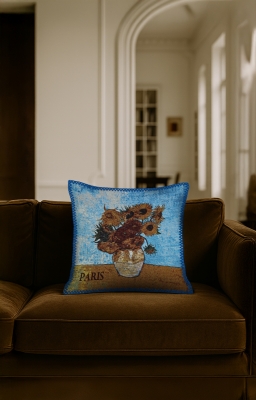 Ünlü Sanatçıların Eserleri Goblen, renkli çözgü ve atkı ipliklerinin yüzyıllardır kullanılan geleneksel dokuma teknikleriyle modern makinelerde işlenmesiyle üretilen özel bir kumaş türüdür. Bu ürün, goblen dokuma ile üretilmiş dekoratif bir yastıktır. Bu koleksiyonda, ünlü sanatçıların ölümsüz eserleri kumaş üzerinde yeniden hayat bulmuştur.İlgili Ürünler