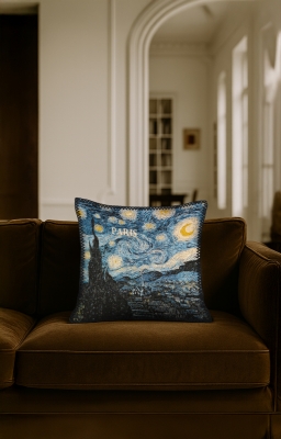 Ünlü Sanatçıların Eserleri Goblen, renkli çözgü ve atkı ipliklerinin yüzyıllardır kullanılan geleneksel dokuma teknikleriyle modern makinelerde işlenmesiyle üretilen özel bir kumaş türüdür. Bu ürün, goblen dokuma ile üretilmiş dekoratif bir yastıktır. Bu koleksiyonda, ünlü sanatçıların ölümsüz eserleri kumaş üzerinde yeniden hayat bulmuştur.İlgili Ürünler
