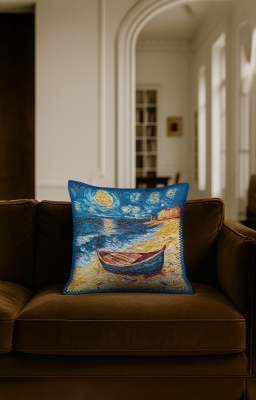Ünlü Sanatçıların Eserleri Goblen, renkli çözgü ve atkı ipliklerinin yüzyıllardır kullanılan geleneksel dokuma teknikleriyle modern makinelerde işlenmesiyle üretilen özel bir kumaş türüdür. Bu ürün, goblen dokuma ile üretilmiş dekoratif bir yastıktır. Bu koleksiyonda, ünlü sanatçıların ölümsüz eserleri kumaş üzerinde yeniden hayat bulmuştur.İlgili Ürünler